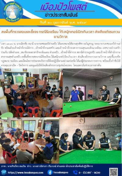 วันที่ ๒๐ กุมภาพันธ์ พ.ศ. ๒๕๖๙ เวลา ๑๓.๓๐ น. นายฉัตรชัย ธนามี นายกเทศมนตรีตำบลปัว ได้มอบหมายให้นายสุวพัชร ยะวิญชาญ รองนายกเทศมนตรีตำบลปัว พร้อมด้วยเจ้าหน้าที่งานนิติการ , เจ้าหน้าที่งานเทศกิจ และเจ้าหน้าที่กองสาธารณสุขและสิ่งแวดล้อม เทศบาลตำบลปัว ร่วมกับ ปลัดอำเภอ , สมาชิกกองอาสารักษาดินแดน อำเภอปัว , เจ้าหน้าที่ตำรวจ สถานีตำรวจภูธรปัว และเจ้าหน้าที่สำนักงานสาธารณสุขอำเภอปัว ลงพื้นที่ตรวจสอบกรณีร้องเรียน โต๊ะสนุ๊กเกอร์เปิดเกินเวลา ส่งเสียงดังรบกวนยามวิกาล และชี้แจงข้อกฎหมาย ระเบียบ และเงื่อนไขการประกอบกิจการที่ต้องปฏิบัติตามอย่างเคร่งครัด ให้แก่ผู้ประกอบการทราบ พร้อมทั้งกำชับให้ควบคุมเวลาเปิด – ปิดกิจการ และดูแลไม่ให้เกิดเสียงดังรบกวนชุมชนโดยรอบ โดยเฉพาะในช่วงเวลากลางคืน