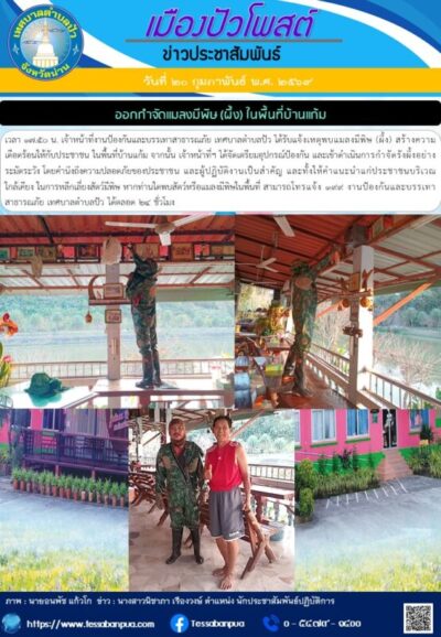 วันที่ ๒๐ กุมภาพันธ์ พ.ศ. ๒๕๖๙ เวลา ๑๗.๕๐ น. เจ้าหน้าที่งานป้องกันและบรรเทาสาธารณภัย เทศบาลตำบลปัว ได้รับแจ้งเหตุพบแมลงมีพิษ (ผึ้ง) สร้างความเดือดร้อนให้กับประชาชน ในพื้นที่บ้านแก้ม จากนั้น เจ้าหน้าที่ฯ ได้จัดเตรียมอุปกรณ์ป้องกัน และเข้าดำเนินการกำจัดรังผึ้งอย่างระมัดระวัง โดยคำนึงถึงความปลอดภัยของประชาชน และผู้ปฏิบัติงานเป็นสำคัญ และทั้งให้คำแนะนำแก่ประชาชนบริเวณใกล้เคียง ในการหลีกเลี่ยงสัตว์มีพิษ หากท่านใดพบสัตว์หรือแมลงมีพิษในพื้นที่ สามารถโทรแจ้ง ๑๙๙ งานป้องกันและบรรเทาสาธารณภัย เทศบาลตำบลปัว ได้ตลอด ๒๔ ชั่วโมง