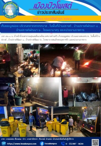 วันที่ ๒๓ กุมภาพันธ์ พ.ศ. ๒๕๖๙ เวลา ๐๒.๐๐ น. เจ้าหน้าที่กองสาธารณสุขและสิ่งแวดล้อม เทศบาลตำบลปัว เก็บขยะมูลฝอย บริเวณตลาดสดเทศบาล , ในพื้นที่บ้านปรางค์ , บ้านปรางค์พัฒนา ๑ , บ้านปรางค์พัฒนา ๒ , โรงพยาบาลสมเด็จพระยุพราชปัว และหน่วยงานราชการ