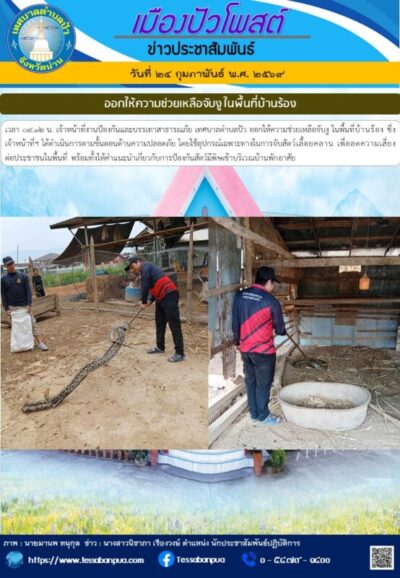 วันที่ ๒๔ กุมภาพันธ์ พ.ศ. ๒๕๖๙ เวลา ๐๙.๑๒ น. เจ้าหน้าที่งานป้องกันและบรรเทาสาธารณภัย เทศบาลตำบลปัว ออกให้ความช่วยเหลือจับงู ในพื้นที่บ้านร้อง ซี่งเจ้าหน้าที่ฯ ได้ดำเนินการตามขั้นตอนด้านความปลอดภัย โดยใช้อุปกรณ์เฉพาะทางในการจับสัตว์เลื้อยคลาน เพื่อลดความเสี่ยงต่อประชาชนในพื้นที่ พร้อมทั้งให้คำแนะนำเกี่ยวกับการป้องกันสัตว์มีพิษเข้าบริเวณบ้านพักอาศัย