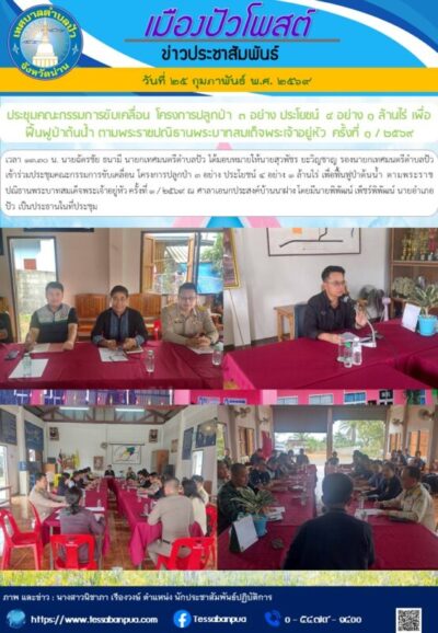 วันที่ ๒๕ กุมภาพันธ์ พ.ศ. ๒๕๖๙ เวลา ๑๓.๓๐ น. นายฉัตรชัย ธนามี นายกเทศมนตรีตำบลปัว ได้มอบหมายให้นายสุวพัชร ยะวิญชาญ รองนายกเทศมนตรีตำบลปัว เข้าร่วมประชุมคณะกรรมการขับเคลื่อน โครงการปลูกป่า ๓ อย่าง ประโยชน์ ๔ อย่าง ๑ ล้านไร่ เพื่อฟื้นฟูป่าต้นน้ำ ตามพระราชปณิธานพระบาทสมเด็จพระเจ้าอยู่หัว ครั้งที่ ๑ / ๒๕๖๙ ณ ศาลาเอนกประสงค์บ้านนาฝาง โดยมีนายพิพัฒน์ เพ็ชร์พิพัฒน์ นายอำเภอปัว เป็นประธานในที่ประชุม