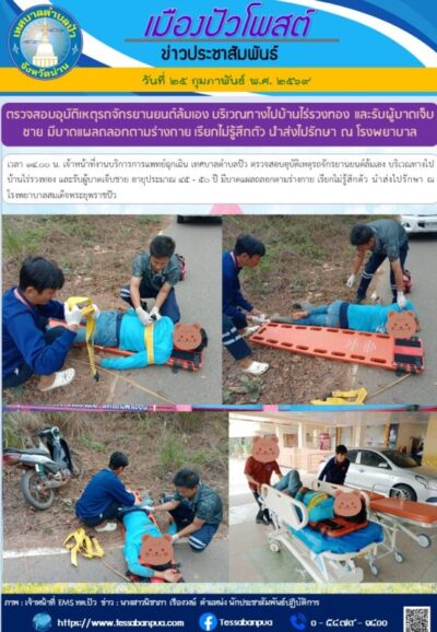 วันที่ ๒๕ กุมภาพันธ์ พ.ศ. ๒๕๖๙ เวลา ๑๔.๐๐ น. เจ้าหน้าที่งานบริการการแพทย์ฉุกเฉิน เทศบาลตำบลปัว ตรวจสอบอุบัติเหตุรถจักรยานยนต์ล้มเอง บริเวณทางไปบ้านไร่รวงทอง และรับผู้บาดเจ็บชาย อายุประมาณ ๔๕ – ๕๐ ปี มีบาดแผลถลอกตามร่างกาย เรียกไม่รู้สึกตัว นำส่งไปรักษา ณ โรงพยาบาลสมเด็จพระยุพราชปัว