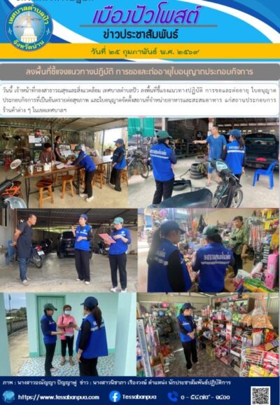 วันที่ ๒๕ กุมภาพันธ์ พ.ศ. ๒๕๖๙ เจ้าหน้าที่กองสาธารณสุขและสิ่งแวดล้อม เทศบาลตำบลปัว ลงพื้นที่ชี้แจงแนวทางปฏิบัติ การขอและต่ออายุ ใบอนุญาตประกอบกิจการที่เป็นอันตรายต่อสุขภาพ และใบอนุญาตจัดตั้งสถานที่จำหน่ายอาหารและสะสมอาหาร แก่สถานประกอบการร้านค้าต่าง ๆ ในเขตเทศบาลฯ