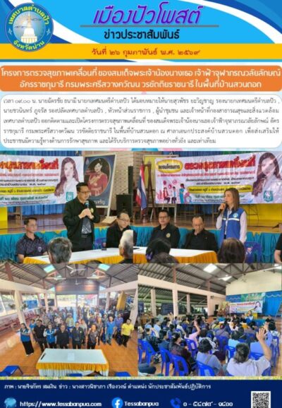 วันที่ ๒๖ กุมภาพันธ์ พ.ศ. ๒๕๖๙ เวลา ๐๙.๐๐ น. นายฉัตรชัย ธนามี นายกเทศมนตรีตำบลปัว ได้มอบหมายให้นายสุวพัชร ยะวิญชาญ รองนายกเทศมนตรีตำบลปัว , นายชวนินทร์ ภูจรัส รองปลัดเทศบาลตำบลปัว , หัวหน้าส่วนราชการ , ผู้นำชุมชน และเจ้าหน้าที่กองสาธารณสุขและสิ่งแวดล้อม เทศบาลตำบลปัว ออกติดตามและเปิดโครงการตรวจสุขภาพเคลื่อนที่ ของสมเด็จพระเจ้าน้องนางเธอ เจ้าฟ้าจุฬาภรณวลัยลักษณ์ อัครราชกุมารี กรมพระศรีสวางควัฒน วรขัตติยราชนารี ในพื้นที่บ้านสวนดอก ณ ศาลาเอนกประสงค์บ้านสวนดอก เพื่อส่งเสริมให้ประชาชนมีความรู้ทางด้านการรักษาสุขภาพ และได้รับบริการตรวจสุขภาพอย่างทั่วถึง และเท่าเทียม