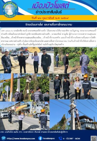 วันที่ ๒๖ กุมภาพันธ์ พ.ศ. ๒๕๖๙ เวลา ๐๙.๓๐ น. นายฉัตรชัย ธนามี นายกเทศมนตรีตำบลปัว ได้มอบหมายให้นายสุวพัชร ยะวิญชาญ รองนายกเทศมนตรีตำบลปัว พร้อมด้วยนายชวนินทร์ ภูจรัส รองปลัดเทศบาลตำบลปัว , นางอมรรัตน์ หาญต๊ะ ผู้อำนวยการกองสาธารณสุขและสิ่งแวดล้อม , เจ้าหน้าที่กองสาธารณสุขและสิ่งแวดล้อม , เจ้าหน้าที่งานเทศกิจ และเจ้าหน้าที่งานจัดสถานที่และการไฟฟ้าสาธารณะ เทศบาลตำบลปัว ดำเนินการจัดระเบียบสายไฟ และสายสื่อสารโทรคมนาคม ร่วมกับเจ้าหน้าที่บริษัทสายสื่อสารบริเวณริมถนนน่าน – ทุ่งช้าง ตั้งแต่ร้านลัคกี้ซูเปอร์สโตร์ จนถึงร้านสุเกียววัสดุก่อสร้าง