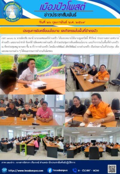 วันที่ ๒๖ กุมภาพันธ์ พ.ศ. ๒๕๖๙ เวลา ๑๓.๓๐ น. นายฉัตรชัย ธนามี นายกเทศมนตรีตำบลปัว ได้มอบหมายให้นายพูลสวัสดิ์ ศิริรัตน์ ประธานสภาเทศบาลตำบลปัว และนายนำชาติ จันทร์ดี ปลัดเทศบาลตำบลปัว เข้าร่วมประชุมการขับเคลื่อนนโยบาย และกิจกรรมในพื้นที่อำเภอปัว ณ ห้องประชุมพญาผานอง ชั้น ๒ ที่ว่าการอำเภอปัว โดยมีนายพิพัฒน์ เพ็ชร์พิพัฒน์ นายอำเภอปัว เป็นประธานในที่ประชุม เพื่อมอบหมายงานต่าง ๆ ให้คณะกรรมการทำงานรับผิดชอบ