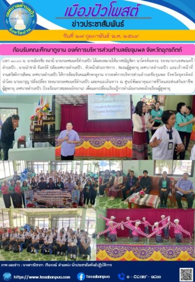 วันที่ ๒๗ กุมภาพันธ์ พ.ศ. ๒๕๖๙ เวลา ๑๐.๐๐ น. นายฉัตรชัย ธนามี นายกเทศมนตรีตำบลปัว ได้มอบหมายให้นางชนัญชิดา นาโครคินทระ รองนายกเทศมนตรีตำบลปัว , นายนำชาติ จันทร์ดี ปลัดเทศบาลตำบลปัว , หัวหน้าส่วนราชการ , ชมรมผู้สูงอายุ เทศบาลตำบลปัว และเจ้าหน้าที่งานสวัสดิการสังคม เทศบาลตำบลปัว ให้การต้อนรับคณะศึกษาดูงาน จากองค์การบริหารส่วนตำบลชัยจุมพล จังหวัดอุตรดิตถ์ นำโดย นายมารุญ ปลั่งเปลื่อง รองนายกเทศมนตรีตำบลปัว และคณะเดินทาง ณ ศูนย์พัฒนาคุณภาพชีวิตและส่งเสริมอาชีพผู้สูงอายุ เทศบาลตำบลปัว (โรงเรียนกาสะลองเบิกบาน) เพื่อแลกเปลี่ยนเรียนรู้การดำเนินงานของโรงเรียนผู้สูงอายุ