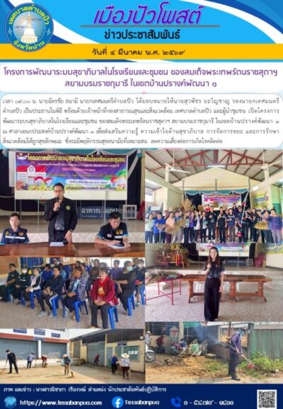 วันที่ ๔ มีนาคม พ.ศ. ๒๕๖๙ เวลา ๐๙.๐๐ น. นายฉัตรชัย ธนามี นายกเทศมนตรีตำบลปัว ได้มอบหมายให้นายสุวพัชร ยะวิญชาญ รองนายกเทศมนตรีตำบลปัว เป็นประธานในพิธี พร้อมด้วยเจ้าหน้าที่กองสาธารณสุขและสิ่งแวดล้อม เทศบาลตำบลปัว และผู้นำชุมชน เปิดโครงการพัฒนาระบบสุขาภิบาลในโรงเรียนและชุมชน ของสมเด็จพระเทพรัตนราชสุดาฯ สยามบรมราชกุมารี ในเขตบ้านปรางค์พัฒนา ๑ ณ ศาลาเอนกประสงค์บ้านปรางค์พัฒนา ๑ เพื่อส่งเสริมความรู้ ความเข้าใจด้านสุขาภิบาล การจัดการขยะ และการรักษาสิ่งแวดล้อมให้ถูกสุขลักษณะ ซึ่งจะมีพฤติกรรมสุขอนามัยที่เหมาะสม ลดความเสี่ยงต่อการเกิดโรคติดต่อ