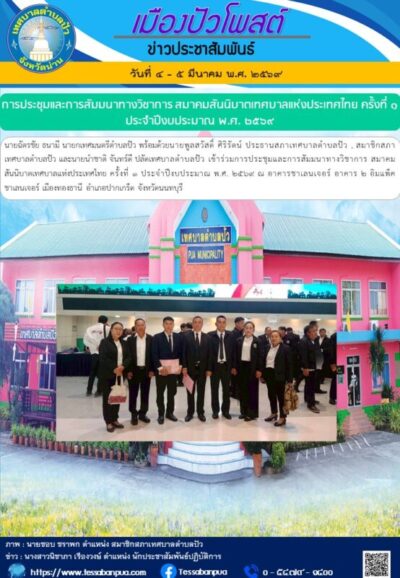 วันที่ ๔ – ๕ มีนาคม พ.ศ. ๒๕๖๙ นายฉัตรชัย ธนามี นายกเทศมนตรีตำบลปัว พร้อมด้วยนายพูลสวัสดิ์ ศิริรัตน์ ประธานสภาเทศบาลตำบลปัว , สมาชิกสภาเทศบาลตำบลปัว และนายนำชาติ จันทร์ดี ปลัดเทศบาลตำบลปัว เข้าร่วมการประชุมและการสัมมนาทางวิชาการ สมาคมสันนิบาตเทศบาลแห่งประเทศไทย ครั้งที่ ๑ ประจำปีงบประมาณ พ.ศ. ๒๕๖๙ ณ อาคารชาเลนเจอร์ อาคาร ๒ อิมแพ็ค ชาเลนเจอร์ เมืองทองธานี อำเภอปากเกร็ด จังหวัดนนทบุรี