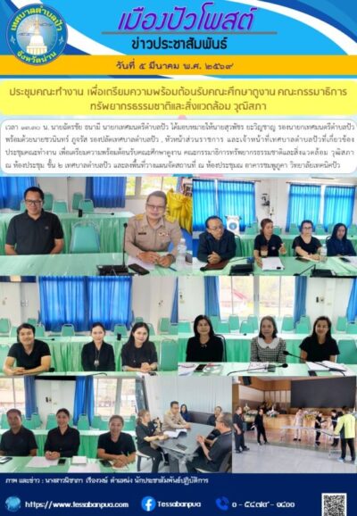 วันที่ ๕ มีนาคม พ.ศ. ๒๕๖๙ เวลา ๑๓.๓๐ น. นายฉัตรชัย ธนามี นายกเทศมนตรีตำบลปัว ได้มอบหมายให้นายสุวพัชร ยะวิญชาญ รองนายกเทศมนตรีตำบลปัว พร้อมด้วยนายชวนินทร์ ภูจรัส รองปลัดเทศบาลตำบลปัว , หัวหน้าส่วนราชการ และเจ้าหน้าที่เทศบาลตำบลปัวที่เกี่ยวข้อง ประชุมคณะทำงาน เพื่อเตรียมความพร้อมต้อนรับคณะศึกษาดูงาน คณะกรรมาธิการทรัพยากรธรรมชาติและสิ่งแวดล้อม วุฒิสภา ณ ห้องประชุม ชั้น ๒ เทศบาลตำบลปัว และลงพื้นที่วางแผนจัดสถานที่ ณ ห้องประชุมณ อาคารชมพูภูคา วิทยาลัยเทคนิคปัว