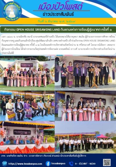วันที่ ๖ มีนาคม พ.ศ. ๒๕๖๙ เวลา ๐๘.๓๐ น. นายฉัตรชัย ธนามี นายกเทศมนตรีตำบลปัว ได้มอบหมายให้นางบุษบา สมเงิน ผู้อำนวยการกองการศึกษา พร้อมกับบุคลากรครู และตัวแทนเด็กนักเรียน ศูนย์พัฒนาเด็กเล็ก เทศบาลตำบลปัว เข้าร่วมกิจกรรม OPEN HOUSE SRISAWONG LAND ดินแดนแห่งการเรียนรู้สู่อนาคต ครั้งที่ ๑ ณ โรงเรียนองค์การบริหารส่วนจังหวัดน่าน ๒ ศรีสระวงศ์ โดยนางนิลัดดา เพตะกร ผู้อำนวยการโรงเรียน ได้กล่าวรายงานวัตถุประสงค์การจัดงานต่อ นายนพรัตน์ ถาวงศ์ นายกองค์การบริหารส่วนจังหวัดน่าน ประธานในพิธี