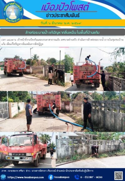 วันที่ ๖ มีนาคม พ.ศ. ๒๕๖๙ เวลา ๑๔.๓๙ น. เจ้าหน้าที่งานป้องกันและบรรเทาสาธารณภัย เทศบาลตำบลปัว ดำเนินการล้างท่อระบายน้ำภายในชุมชนบ้านแก้ม เพื่อแก้ไขปัญหากลิ่นเหม็นจากสิ่งปฏิกูล