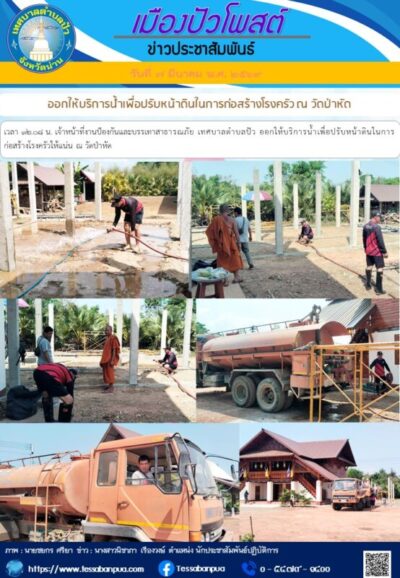 วันที่ ๗ มีนาคม พ.ศ. ๒๕๖๙ เวลา ๑๒.๐๘ น. เจ้าหน้าที่งานป้องกันและบรรเทาสาธารณภัย เทศบาลตำบลปัว ออกให้บริการน้ำเพื่อปรับหน้าดินในการก่อสร้างโรงครัวให้แน่น ณ วัดป่าหัด