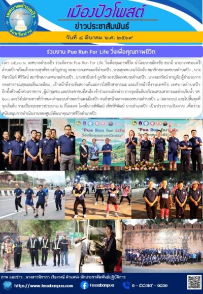 วันที่ ๘ มีนาคม พ.ศ. ๒๕๖๙ เวลา ๐๕.๓๐ น. เทศบาลตำบลปัว ร่วมจัดงาน Pua Run For Life วิ่งเพื่อคุณภาพชีวิต นำโดยนายฉัตรชัย ธนามี นายกเทศมนตรีตำบลปัว พร้อมด้วยนายสุวพัชร ยะวิญชาญ รองนายกเทศมนตรีตำบลปัว , นายสุเทพ เจนวินิจฉัย สมาชิกสภาเทศบาลตำบลปัว , นางทิพานันท์ ศิริรัตน์ สมาชิกสภาเทศบาลตำบลปัว , นายชวนินทร์ ภูจรัส รองปลัดเทศบาลตำบลปัว , นางอมรรัตน์ หาญต๊ะ ผู้อำนวยการกองสาธารณสุขและสิ่งแวดล้อม , เจ้าหน้าที่งานจัดสถานที่และการไฟฟ้าสาธารณะ และเจ้าหน้าที่งานเทศกิจ เทศบาลตำบลปัว อีกทั้งหัวหน้าส่วนราชการ , ผู้นำชุมชน และประชาชนที่สนใจ เข้าร่วมงานดังกล่าว จากจุดเริ่มต้นบริเวณสวนสาธารณะอ่างเก็บน้ำ รศ. ๒๐๐ และวิ่งไปตามทางที่กำหนด ผ่านแบบจำลองกำแพงเมืองปัว จนถึงหน้าตลาดสดเทศบาลตำบลปัว ๑ (ตลาดบน) และไปสิ้นสุดที่จุดเริ่มต้น รวมเป็นระยะทางประมาณ ๒ กิโลเมตร โดยมีนายพิพัฒน์ เพ็ชร์พิพัฒน์ นายอำเภอปัว เป็นประธานเปิดงาน เพื่อร่วมสนับสนุนการดำเนินงานของศูนย์พัฒนาคุณภาพชีวิตอำเภอปัว