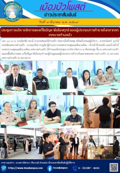 วันที่ ๙ มีนาคม พ.ศ. ๒๕๖๙ เวลา ๑๐.๐๐ น. นายฉัตรชัย ธนามี นายกเทศมนตรีตำบลปัว ประธานในที่ประชุม พร้อมด้วยคณะผู้บริหาร , นายชวนินทร์ ภูจรัส รองปลัดเทศบาลตำบลปัว , นางอมรรัตน์ หาญต๊ะ ผู้อำนวยการกองสาธารณสุขและสิ่งแวดล้อม , เจ้าหน้าที่กองคลัง และเจ้าหน้าที่กองสาธารณสุขและสิ่งแวดล้อม เทศบาลตำบลปัว ได้กำหนดจัดประชุมการบริหารจัดการ ณ ห้องประชุม ชั้น ๒ เทศบาลตำบลปัว และลงพื้นที่ตรวจสอบ แก้ไขปัญหาข้อร้องทุกข์ ของผู้ประมูลและผู้ประกอบการค้าขายในตลาดสดเทศบาลตำบลปัว ณ ตลาดสดเทศบาลตำบลปัว ๒ (ตลาดล่าง)
