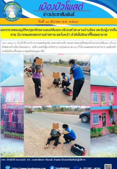 วันที่ ๑๐ มีนาคม พ.ศ. ๒๕๖๙ เวลา ๐๗.๔๐ น. เจ้าหน้าที่งานบริการการแพทย์ฉุกเฉิน เทศบาลตำบลปัว ออกตรวจสอบอุบัติเหตุรถจักรยานยนต์ล้มเอง บริเวณหัวสะพานบ้านร้อง ริมถนนน่าน – ทุ่งช้าง และรับผู้บาดเจ็บชาย อายุประมาณ ๕๐ – ๖๐ ปี มีบาดแผลถลอกตามร่างกาย และใบหน้า นำส่งไปรักษาที่โรงพยาบาลสมเด็จพระยุพราชปัว