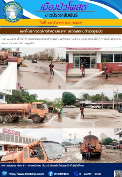 วันที่ ๑๒ มีนาคม พ.ศ. ๒๕๖๙ เวลา ๑๑.๐๕ น. เจ้าหน้าที่งานป้องกันและบรรเทาสาธารณภัย เทศบาลตำบลปัว ดำเนินการออกให้บริการฉีดล้างทำความสะอาด บริเวณสถานีตำรวจภูธรปัว