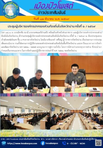 วันที่ ๑๒ มีนาคม พ.ศ. ๒๕๖๙ เวลา ๑๔.๐๐ น. นายฉัตรชัย ธนามี นายกเทศมนตรีตำบลปัว พร้อมด้วยหัวหน้าส่วนราชการ และผู้บริหารองค์กรปกครองส่วนท้องถิ่นในจังหวัดน่าน เข้าร่วมประชุมผู้บริหารองค์กรปกครองส่วนท้องถิ่นในจังหวัดน่าน ครั้งที่ ๒ / ๒๕๖๙ ณ ห้องประชุมพระเจ้าสุริยพงษ์ผริตเดช ชั้น ๓ ศาลากลางจังหวัดน่าน โดยมีนายชัยนรงค์ วงศ์ใหญ่ ผู้ว่าราชการจังหวัดน่าน เป็นประธานการประชุม เพื่อมอบนโยบาย รวมทั้งติดตามการปฏิบัติงานขององค์กรปกครองส่วนท้องถิ่นในพื้นที่จังหวัดน่าน และหารือแนวทางการจัดทำแผนพัฒนาจังหวัดน่าน พ.ศ. ๒๕๗๑ – ๒๕๗๕ แบบบูรณาการสู่ความยั่งยืน โดยการมีส่วนร่วมของทุกภาคส่วน ซึ่งจะนำมากำหนดเป็นกรอบแนวทาง ในการจัดทำแผนปฏิบัติราชการประจำปี พ.ศ. ๒๕๗๑ ของจังหวัดน่าน