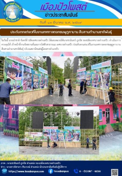 วันที่ ๑๓ มีนาคม พ.ศ. ๒๕๖๙ นายนำชาติ จันทร์ดี ปลัดเทศบาลตำบลปัว ได้มอบหมายให้นายชวนินทร์ ภูจรัส รองปลัดเทศบาลตำบลปัว ดำเนินการควบคุมให้ เจ้าหน้าที่งานจัดสถานที่และการไฟฟ้าสาธารณะ เทศบาลตำบลปัว ประดับตกแต่งเวทีในงานเทศกาลดอกชมพูภูคาบาน สืบสานตำนานชาติพันธุ์ บริเวณสถานีขนส่งผู้โดยสารอำเภอปัว