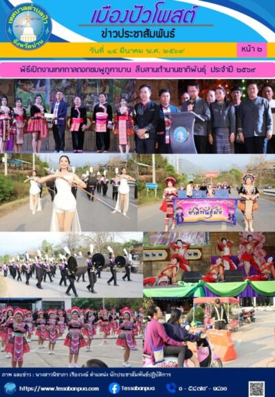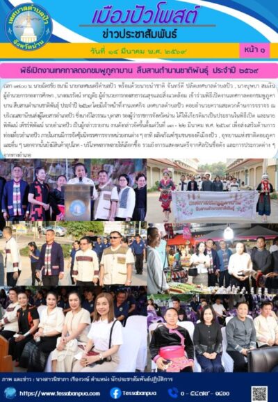 วันที่ ๑๔ มีนาคม พ.ศ. ๒๕๖๙ เวลา ๑๗.๐๐ น. นายฉัตรชัย ธนามี นายกเทศมนตรีตำบลปัว พร้อมด้วยนายนำชาติ จันทร์ดี ปลัดเทศบาลตำบลปัว , นางบุษบา สมเงิน ผู้อำนวยการกองการศึกษา , นางอมรรัตน์ หาญต๊ะ ผู้อำนวยการกองสาธารณสุขและสิ่งแวดล้อม เข้าร่วมพิธีเปิดงานเทศกาลดอกชมพูภูคาบาน สืบสานตำนานชาติพันธุ์ ประจำปี ๒๕๖๙ โดยมีเจ้าหน้าที่งานเทศกิจ เทศบาลตำบลปัว คอยอำนวยความสะดวกด้านการจราจร ณ บริเวณสถานีขนส่งผู้โดยสารอำเภอปัว ซึ่งนางวิไลวรรณ บุดาสา รองผู้ว่าราชการจังหวัดน่าน ได้ให้เกียรติมาเป็นประธานในพิธีเปิด และนายพิพัฒน์ เพ็ชร์พิพัฒน์ นายอำเภอปัว เป็นผู้กล่าวรายงาน งานดังกล่าวจัดขึ้นตั้งแต่วันที่ ๑๓ – ๒๒ มีนาคม พ.ศ. ๒๕๖๙ เพื่อส่งเสริมด้านการท่องเที่ยวอำเภอปัว ภายในงานมีการจัดซุ้มนิทรรศการจากหน่วยงานต่าง ๆ อาทิ ผลิตภัณฑ์ชุมชนของดีเมืองปัว , อุทยานแห่งชาติดอยภูคา และอื่น ๆ นอกจากนั้นยังมีสินค้าอุปโภค – บริโภคหลากหลายให้เลือกซื้อ รวมถึงการแสดงดนตรีจากศิลปินชื่อดัง และการประกวดต่าง ๆ จากทางอำเภอ
