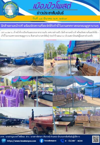 วันที่ ๑๔ มีนาคม พ.ศ. ๒๕๖๙ เวลา ๑๐.๒๙ น. เจ้าหน้าที่งานป้องกันและบรรเทาสาธารณภัย เทศบาลตำบลปัว ฉีดล้างลานหน้าเวที พร้อมจัดสถานที่และจัดโต๊ะ – เก้าอี้ ในงานเทศกาลดอกชมพูภูคาบาน สืบสานตำนานชาติพันธุ์ ประจำปี ๒๕๖๙ ณ บริเวณสถานีขนส่งผู้โดยสารอำเภอปัว