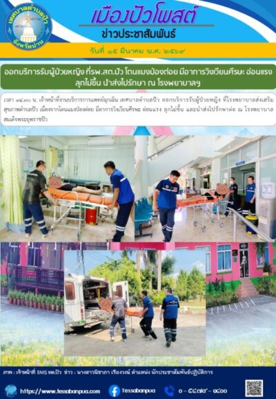 วันที่ ๑๕ มีนาคม พ.ศ. ๒๕๖๙ เวลา ๑๔.๓๐ น. เจ้าหน้าที่งานบริการการแพทย์ฉุกเฉิน เทศบาลตำบลปัว ออกบริการรับผู้ป่วยหญิง ที่โรงพยาบาลส่งเสริมสุขภาพตำบลปัว เนื่องจากโดนแมงป่องต่อย มีอาการวิงเวียนศีรษะ อ่อนแรง ลุกไม่ขึ้น และนำส่งไปรักษาต่อ ณ โรงพยาบาลสมเด็จพระยุพราชปัว