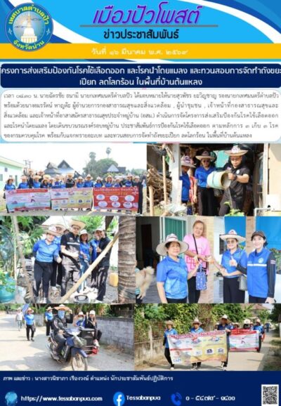 วันที่ ๑๖ มีนาคม พ.ศ. ๒๕๖๙ เวลา ๐๘.๓๐ น. นายฉัตรชัย ธนามี นายกเทศมนตรีตำบลปัว ได้มอบหมายให้นายสุวพัชร ยะวิญชาญ รองนายกเทศมนตรีตำบลปัว พร้อมด้วยนางอมรรัตน์ หาญต๊ะ ผู้อำนวยการกองสาธารณสุขและสิ่งแวดล้อม , ผู้นำชุมชน , เจ้าหน้าที่กองสาธารณสุขและสิ่งแวดล้อม และเจ้าหน้าที่อาสาสมัครสาธารณสุขประจำหมู่บ้าน (อสม.) ดำเนินการจัดโครงการส่งเสริมป้องกันโรคไข้เลือดออก และโรคนำโดยแมลง โดยเดินขบวนรณรงค์รอบหมู่บ้าน ประชาสัมพันธ์การป้องกันโรคไข้เลือดออก ตามหลักการ ๓ เก็บ ๓ โรค ของกรมควบคุมโรค พร้อมกับแจกทรายอะเบท และทวนสอบการจัดทำถังขยะเปียก ลดโลกร้อน ในพื้นที่บ้านต้นแหลง