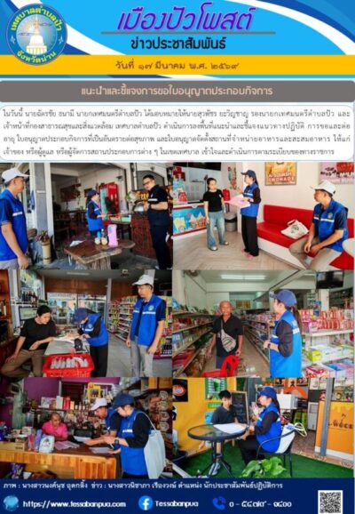 วันที่ ๑๗ มีนาคม พ.ศ. ๒๕๖๙ นายฉัตรชัย ธนามี นายกเทศมนตรีตำบลปัว ได้มอบหมายให้นายสุวพัชร ยะวิญชาญ รองนายกเทศมนตรีตำบลปัว และเจ้าหน้าที่กองสาธารณสุขและสิ่งแวดล้อม เทศบาลตำบลปัว ดำเนินการลงพื้นที่แนะนำและชี้แจงแนวทางปฏิบัติ การขอและต่ออายุ ใบอนุญาตประกอบกิจการที่เป็นอันตรายต่อสุขภาพ และใบอนุญาตจัดตั้งสถานที่จำหน่ายอาหารและสะสมอาหาร ให้แก่เจ้าของ หรือผู้ดูแล หรือผู้จัดการสถานประกอบการต่าง ๆ ในเขตเทศบาล เข้าใจและดำเนินการตามระเบียบของทางราชการ