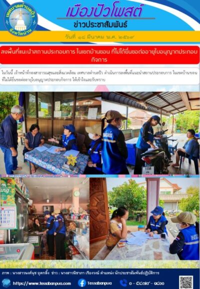 วันที่ ๑๘ มีนาคม พ.ศ. ๒๕๖๙ เจ้าหน้าที่กองสาธารณสุขและสิ่งแวดล้อม เทศบาลตำบลปัว ดำเนินการลงพื้นที่แนะนำสถานประกอบการ ในเขตบ้านขอน ที่ไม่ได้ยื่นขอต่ออายุใบอนุญาตประกอบกิจการ ให้เข้าใจและรับทราบ