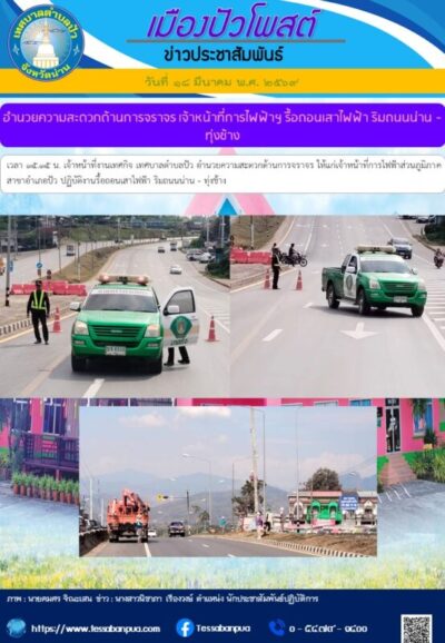 วันที่ ๑๘ มีนาคม พ.ศ. ๒๕๖๙ เวลา ๑๕.๑๕ น. เจ้าหน้าที่งานเทศกิจ เทศบาลตำบลปัว อำนวยความสะดวกด้านการจราจร ให้แก่เจ้าหน้าที่การไฟฟ้าส่วนภูมิภาค สาขาอำเภอปัว ปฏิบัติงานรื้อถอนเสาไฟฟ้า ริมถนนน่าน – ทุ่งช้าง