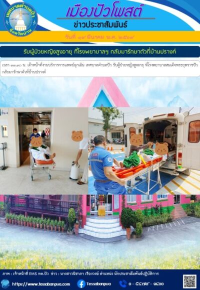 วันที่ ๑๙ มีนาคม พ.ศ. ๒๕๖๙ เวลา ๑๑.๑๐ น. เจ้าหน้าที่งานบริการการแพทย์ฉุกเฉิน เทศบาลตำบลปัว รับผู้ป่วยหญิงสูงอายุ ที่โรงพยาบาลสมเด็จพระยุพราชปัว กลับมารักษาตัวที่บ้านปรางค์