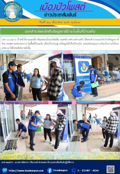 วันที่ ๒๐ มีนาคม พ.ศ. ๒๕๖๙ เวลา ๑๐.๓๔ น. เจ้าหน้าที่งานแผนที่ภาษีและทะเบียนทรัพย์สิน กองคลัง เทศบาลตำบลปัว ได้ออกสำรวจและจัดเก็บข้อมูลภาษีป้าย ของสถานประกอบการ ในพื้นที่บ้านแก้ม เพื่อปรับปรุงฐานข้อมูลให้เป็นปัจจุบัน และสนับสนุนการจัดเก็บรายได้ของเทศบาล ให้มีประสิทธิภาพยิ่งขึ้น