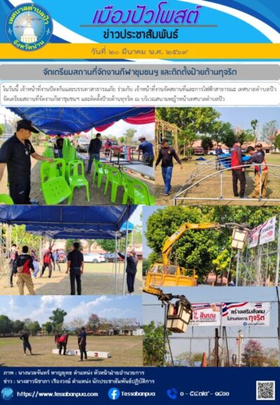 วันที่ ๒๐ มีนาคม พ.ศ. ๒๕๖๙ เจ้าหน้าที่งานป้องกันและบรรเทาสาธารณภัย ร่วมกับ เจ้าหน้าที่งานจัดสถานที่และการไฟฟ้าสาธารณะ เทศบาลตำบลปัว จัดเตรียมสถานที่จัดงานกีฬาชุมชนฯ และติดตั้งป้ายต้านทุจริต ณ บริเวณสนามหญ้าหน้าเทศบาลตำบลปัว