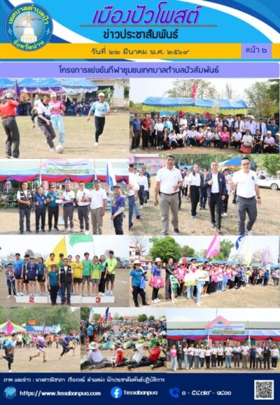 วันที่ ๒๒ มีนาคม พ.ศ. ๒๕๖๙ เวลา ๐๘.๓๐ น. เทศบาลตำบลปัว ได้จัดโครงการแข่งขันกีฬาชุมชนเทศบาลตำบลปัวสัมพันธ์ ณ บริเวณสนามหญ้าหน้าเทศบาลตำบลปัว เพื่อสร้างความสามัคคีระหว่างส่วนราชการและภายในชุมชน โดยมีนายฉัตรชัย ธนามี นายกเทศมนตรีตำบลปัว เป็นผู้กล่าวรายงานต่อ นายพิพัฒน์ เพ็ชร์พิพัฒน์ นายอำเภอปัว ประธานในพิธี ตลอดจนคณะผู้บริหาร , นายพูลสวัสดิ์ ศิริรัตน์ ประธานสภาเทศบาลตำบลปัว , สมาชิกสภาเทศบาลตำบลปัว , นายนำชาติ จันทร์ดี ปลัดเทศบาลตำบลปัว , หัวหน้าส่วนราชการ , พนักงานเทศบาล , ลูกจ้างเทศบาลตำบลปัว , ผู้นำชุมชน และประชาชน เข้าร่วมโครงการดังกล่าวอย่างพร้อมเพรียงกัน ภายในงานมีการจัดการแข่งขันกีฬาทั้งหมด ๗ ประเภท ได้แก่ วิ่งซุปเปอร์แมน , อุ้มลูกโป่งน้ำ , ตีกอล์ฟมะเขือยาว , ส่งแป้งกลับหลัง , วิ่งผลัด , สาลิกาลิ้นทอง , วิ่งห่วงยาง และพิเศษการแข่งขันกีฬาฟุตบอล ระหว่างหัวหน้าส่วนราชการ กับ ผู้นำชุมชน รวมถึงการแข่งขันกีฬาฟุตบอลแม่บ้าน และผู้นำชุมชน ผลการแข่งขันรวม รางวัลชนะเลิศ ได้แก่ บ้านต้นแหลง รางวัลรองชนะเลิศอันดับที่ ๒ ได้แก่ บ้านสวนดอก รางวัลรองชนะเลิศอันดับที่ ๓ ได้แก่ บ้านแก้ม และบ้านอื่น ๆ ได้รับรางวัลชมเชย