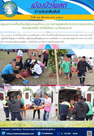 วันที่ ๒๒ มีนาคม พ.ศ. ๒๕๖๙ เวลา ๑๓.๔๖ น. เจ้าหน้าที่งานบริการการแพทย์ฉุกเฉิน ร่วมกับ เจ้าหน้าที่งานป้องกันและบรรเทาสาธารณภัย เทศบาลตำบลปัว ปฏิบัติหน้าที่ปฐมพยาบาลเบื้องต้น แก่ผู้ประสบอุบัติเหตุในระหว่างการแข่งขันกีฬาฯ ณ บริเวณสนามหญ้าหน้าเทศบาลตำบลปัว มีอาการปวดบริเวณต้นขาและสะโพก นำส่งไปรักษา ณ โรงพยาบาลสมเด็จพระยุพราชปัว