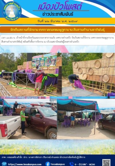 วันที่ ๒๒ มีนาคม พ.ศ. ๒๕๖๙ เวลา ๑๓.๕๖ น. เจ้าหน้าที่งานป้องกันและบรรเทาสาธารณภัย เทศบาลตำบลปัว จัดเก็บสถานที่จัดงาน เทศกาลดอกชมพูภูคาบาน สืบสานตำนานชาติพันธุ์ หลังเสร็จสิ้นการจัดงาน ณ บริเวณสถานีขนส่งผู้โดยสารอำเภอปัว