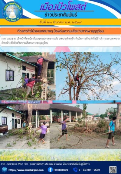 วันที่ ๒๓ มีนาคม พ.ศ. ๒๕๖๙ เวลา ๐๗.๓๕ น. เจ้าหน้าที่งานป้องกันและบรรเทาสาธารณภัย เทศบาลตำบลปัว ดำเนินการตัดแต่งกิ่งไม้ บริเวณรอบเทศบาลตำบลปัว เพื่อป้องกันความเสียหายจากพายุฤดูร้อน