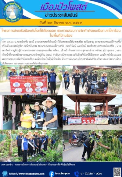 วันที่ ๒๓ มีนาคม พ.ศ. ๒๕๖๙ เวลา ๐๙.๐๐ น. นายฉัตรชัย ธนามี นายกเทศมนตรีตำบลปัว ได้มอบหมายให้นายสุวพัชร ยะวิญชาญ รองนายกเทศมนตรีตำบลปัว พร้อมด้วยนางชนัญชิดา นาโครคินทระ รองนายกเทศมนตรีตำบลปัว , นายวิวัฒน์ เนตรทิพย์ สมาชิกสภาเทศบาลตำบลปัว , นางอมรรัตน์ หาญต๊ะ ผู้อำนวยการกองสาธารณสุขและสิ่งแวดล้อม , เจ้าหน้าที่กองสาธารณสุขและสิ่งแวดล้อม, ผู้นำชุมชน , และเจ้าหน้าที่อาสาสมัครสาธารณสุขประจำหมู่บ้าน (อสม.) ดำเนินการโครงการส่งเสริมป้องกันโรคไข้เลือดออก และโรคนำโดยแมลง และทวนสอบการจัดทำถังขยะเปียก ลดโลกร้อน ในพื้นที่บ้านร้อง ด้วยการเดินรณรงค์ประชาสัมพันธ์ป้องกันการแพร่ระบาดโรคไข้เลือดออก และแจกทรายอะเบทให้แก่ประชาชน