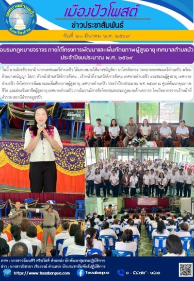 วันที่ ๒๐ มีนาคม พ.ศ. ๒๕๖๙ นายฉัตรชัย ธนามี นายกเทศมนตรีตำบลปัว ได้มอบหมายให้นางชนัญชิดา นาโครคินทระ รองนายกเทศมนตรีตำบลปัว พร้อมด้วยนางอนัญญา โสภา หัวหน้าฝ่ายสวัสดิการสังคม , เจ้าหน้าที่งานสวัสดิการสังคม เทศบาลตำบลปัว และชมรมผู้สูงอายุ เทศบาลตำบลปัว จัดโครงการพัฒนาและเพิ่มศักยภาพผู้สูงอายุ เทศบาลตำบลปัว ประจำปีงบประมาณ พ.ศ. ๒๕๖๙ ณ ศูนย์พัฒนาคุณภาพชีวิต และส่งเสริมอาชีพผู้สูงอายุ เทศบาลตำบลปัว ภายในงานมีการจัดกิจกรรมอบรมกฎหมายด้านจราจร โดยวิทยากรจากเจ้าหน้าที่ตำรวจ สถานีตำรวจภูธรปัว