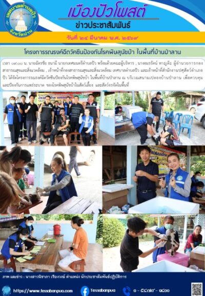 วันที่ ๒๔ มีนาคม พ.ศ. ๒๕๖๙ เวลา ๐๙.๐๐ น. นายฉัตรชัย ธนามี นายกเทศมนตรีตำบลปัว พร้อมด้วยคณะผู้บริหาร , นางอมรรัตน์ หาญต๊ะ ผู้อำนวยการกองสาธารณสุขและสิ่งแวดล้อม , เจ้าหน้าที่กองสาธารณสุขและสิ่งแวดล้อม เทศบาลตำบลปัว และเจ้าหน้าที่สำนักงานปศุสัตว์อำเภอปัว ได้จัดโครงการรณรงค์ฉีดวัคซีนป้องกันโรคพิษสุนัขบ้า ในพื้นที่บ้านป่าลาน ณ บริเวณสนามเปตองบ้านป่าลาน เพื่อควบคุมและป้องกันการแพร่ระบาด ของโรคพิษสุนัขบ้าในสัตว์เลี้ยง และสัตว์จรจัดในพื้นที่