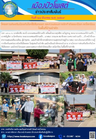 วันที่ ๒๔ มีนาคม พ.ศ. ๒๕๖๙ เวลา ๐๙.๐๐ น. นายฉัตรชัย ธนามี นายกเทศมนตรีตำบลปัว พร้อมด้วยนายสุวพัชร ยะวิญชาญ รองนายกเทศมนตรีตำบลปัว , นางชนัญชิดา นาโครคินทระ รองนายกเทศมนตรีตำบลปัว , นางสมร วรรณภพ สมาชิกสภาเทศบาลตำบลปัว , เจ้าหน้าที่กองสาธารณสุขและสิ่งแวดล้อม, ผู้นำชุมชน , และเจ้าหน้าที่อาสาสมัครสาธารณสุขประจำหมู่บ้าน (อสม.) ออกเดินรณรงค์ให้ความรู้การป้องกันแพร่ระบาดโรคไข้เลือดออก ในชุมชนบ้านป่าหัด และโรงเรียนป่าหัดขอนป่าลาน ตามโครงการส่งเสริมป้องกันโรคไข้เลือดออก และโรคนำโดยแมลง และทวนสอบการจัดทำถังขยะเปียก ลดโลกร้อน ในพื้นที่บ้านป่าหัด