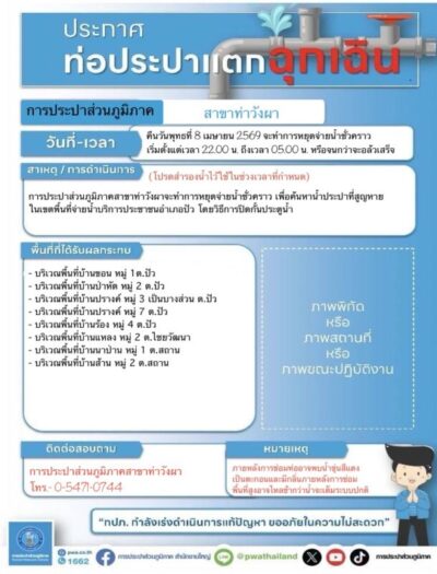 ด้วยการประปาส่วนภูมิภาค สาขาท่าวังผา ได้แจ้งประชาสัมพันธ์ ขอหยุดจ่ายน้ำประปาชั่วคราว ในพื้นที่บ้านขอน , บ้านป่าหัด , บ้านปรางค์ เป็นบางส่วน , บ้านปรางค์พัฒนา ๑ , บ้านร้อง , บ้านต้นแหลง และบ้านนาป่าน ในวันพรุ่งนี้ (วันพุธที่ ๘ เมษายน พ.ศ. ๒๕๖๙) ตั้งแต่เวลา ๒๒.๐๐ – ๐๕.๐๐ น. หรือจนกว่าจะดำเนินการแล้วเสร็จ ซึ่งขอให้ประชาชนในพื้นที่ดังกล่าว โปรดสำรองน้ำให้พอใช้ระหว่างช่วงเวลาข้างต้นดังกล่าว เนื่องจากจะดำเนินการค้นหาน้ำประปาสูญหาย ในเขตพื้นที่จ่ายน้ำบริการประชาชนอำเภอปัว โดยวิธีการปิดกั้นประตูน้ำ หากดำเนินการแล้วเสร็จ จะดำเนินการจ่ายน้ำตามปกติทันที ซึ่งอาจพบน้ำขุ่นมีสีแดง และตะกอนเล็กน้อยภายหลังการซ่อม การประปาส่วนภูมิภาคฯ ต้องขออภัยในความไม่สะดวกมา ณ โอกาสนี้ สอบถามรายละเอียดเพิ่มเติมได้ที่เบอร์ ๐๕๔ – ๗๑๐๗๔๔